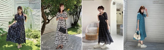 左から ラインフラワーフレアワンピース、花柄フレアワンピース、小花柄フレアフラワーワンピース、カラーワンピース 各¥10,890(tax in)